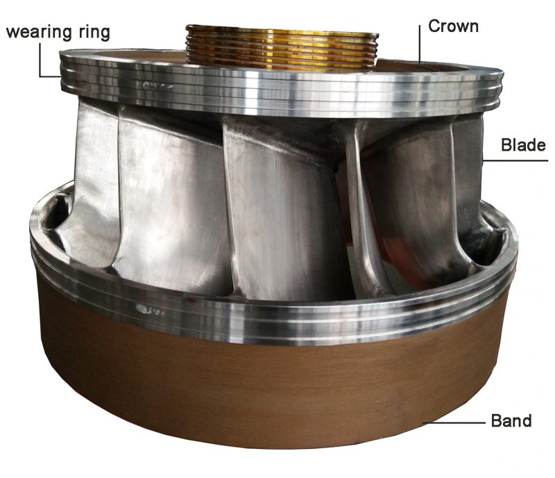 The main parts of the turbine are assembled around the stay ring, There is a bottom ring and draft tube under the stay ring, and a head cover above the stay ring, A spiral case is installed on the outside of the stay ring, A number of guide vanes are installed on the inside of the stay ring, A runner is installed in the middle. The guide bearing of the runner is installed on the head cover. There is a shaft sealing device under the guide bearing to prevent water from leaking into the head cover along the shaft.